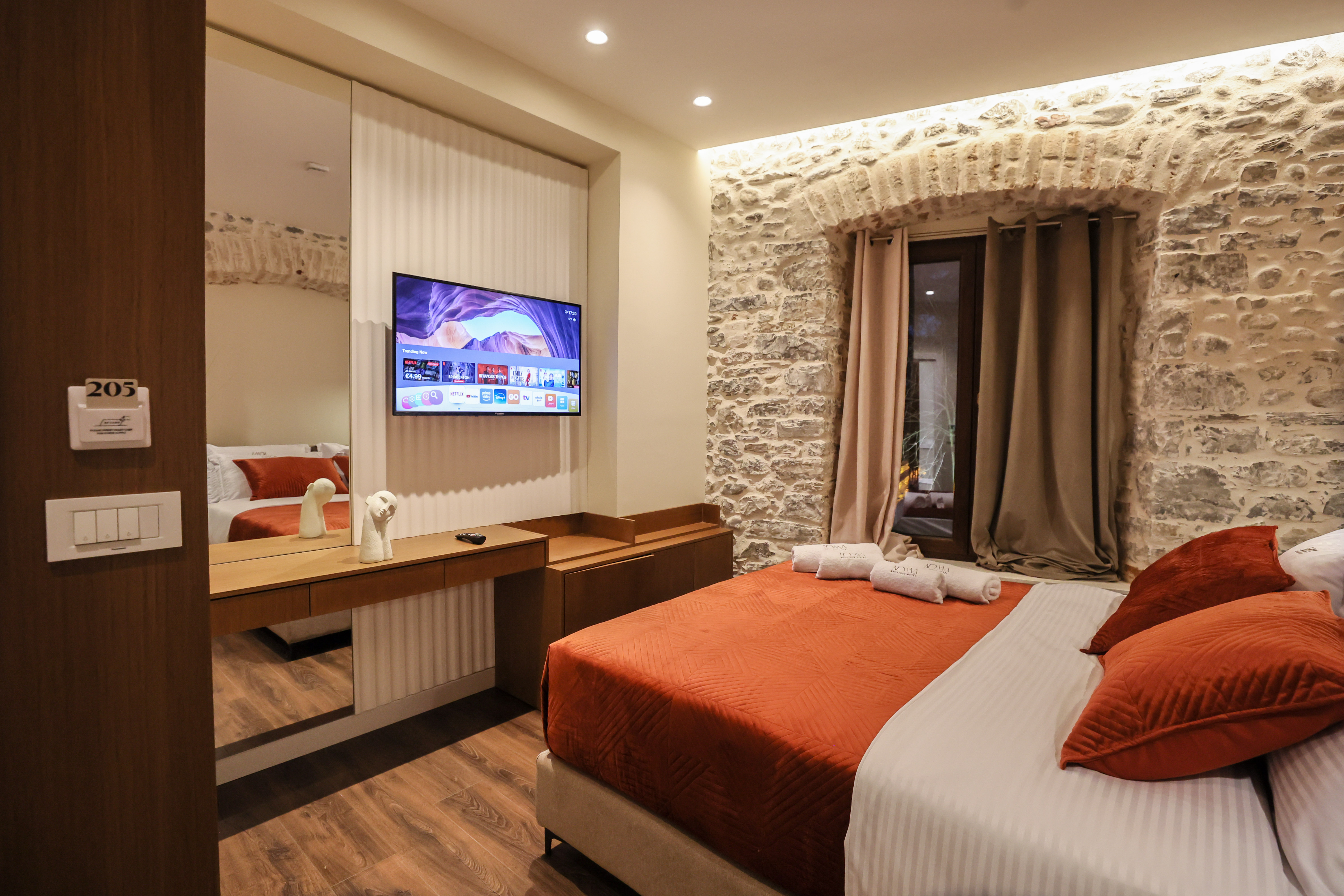 Room Size 32 m2. Our most spacious double category is designed for guests who appreciate extra room, clean design, and a distinctly premium atmosphere. The interior blends comfort and elegance with soundproof walls, air conditioning, and a restful city-view backdrop. A private bathroom with shower and bidet, together with carefully selected amenities and a full-size bed, creates a stay that feels both indulgent and inviting.